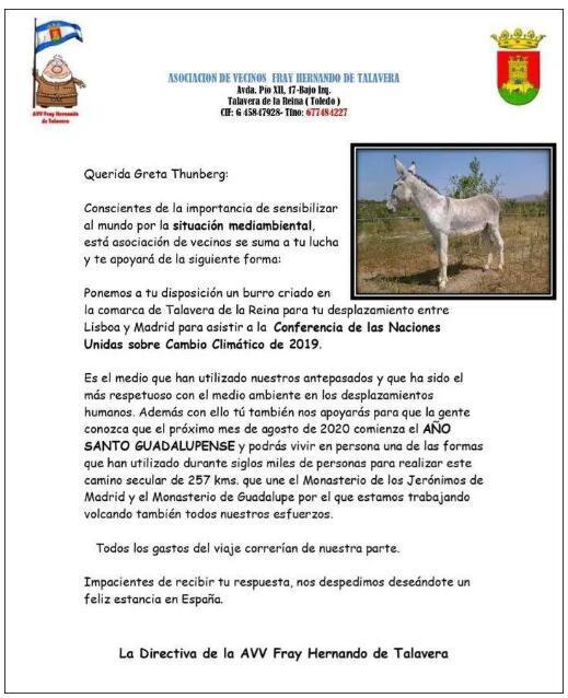 事情是這樣的,最近一段時間,西班牙首都馬德裏正在召開聯合國氣候變化大會,該協會在社交平台上公開表示,要向與會人員之一的格蕾塔讚助一頭驢,以作為她從裏斯本前往馬德裏參加聯合國氣候變化大會最環保的交通工具。